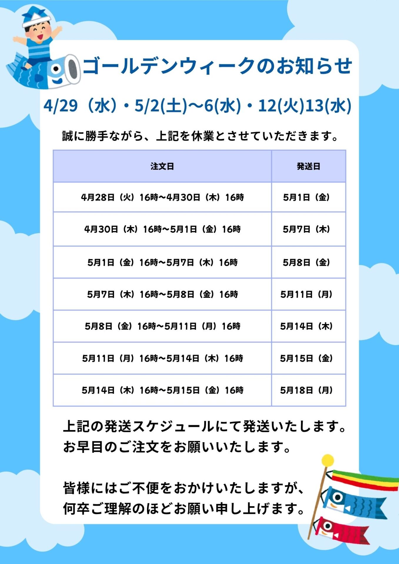 2026年ゴールデンウィークと臨時休業にともなう発送スケジュールについて 2026年4月16日 最終更新日時 : 2026年4月16日 シリカ 2026年5月12日(火)、13日(水)は誠に勝手ながら、臨時休業とさせていただきます。ゴールデンウィークからの発送スケジュールは下記のとおりとなります。